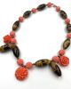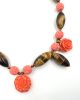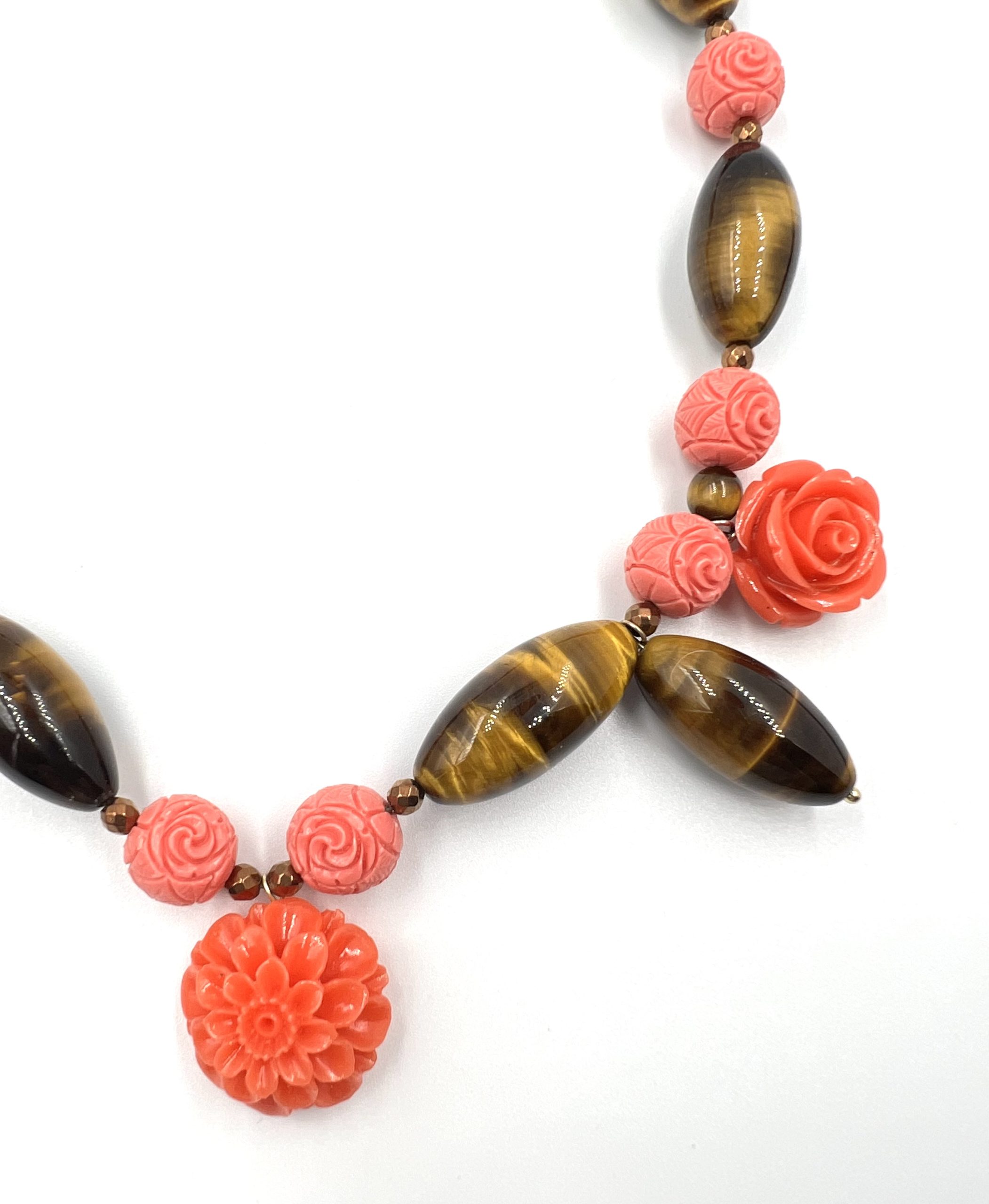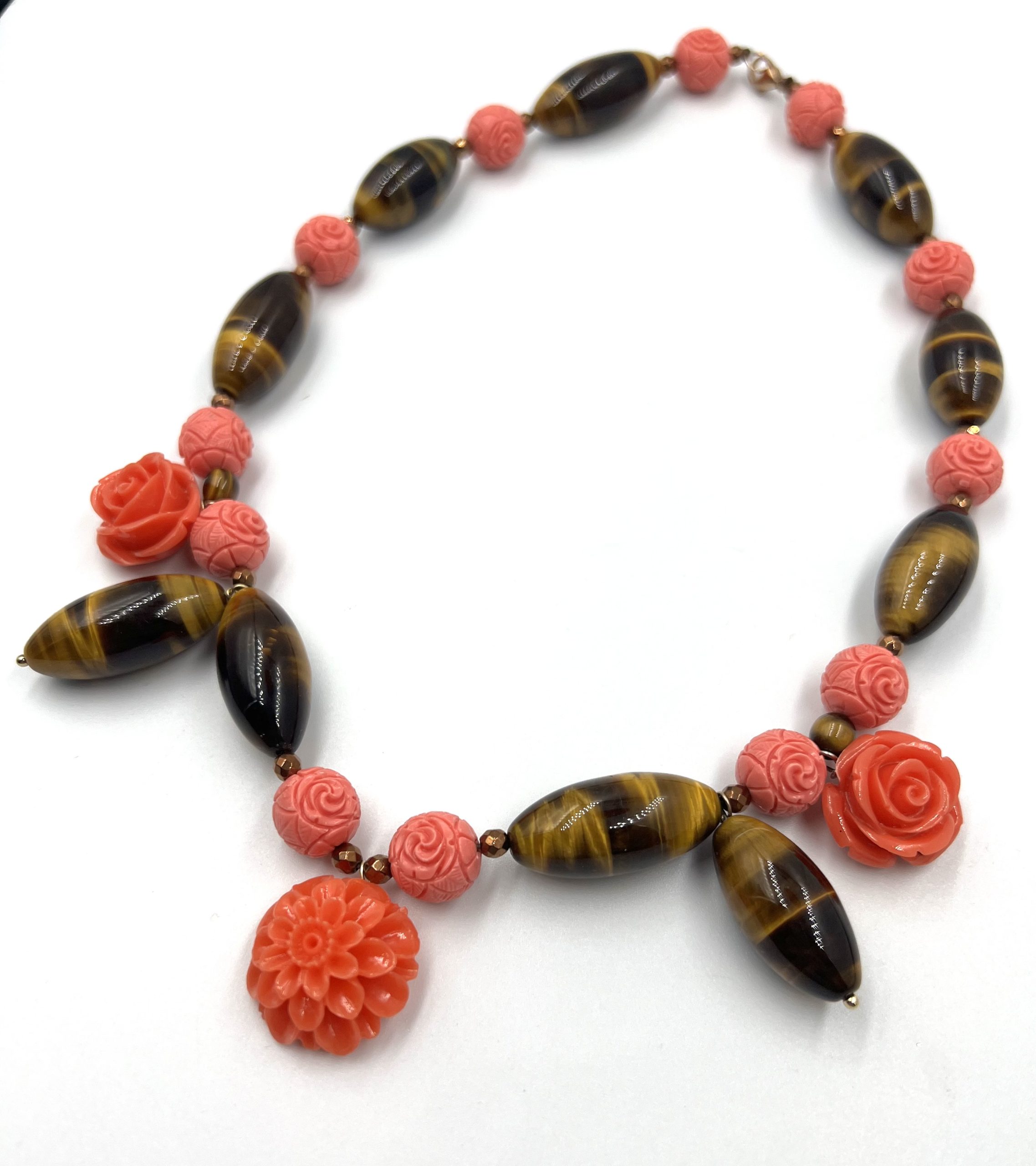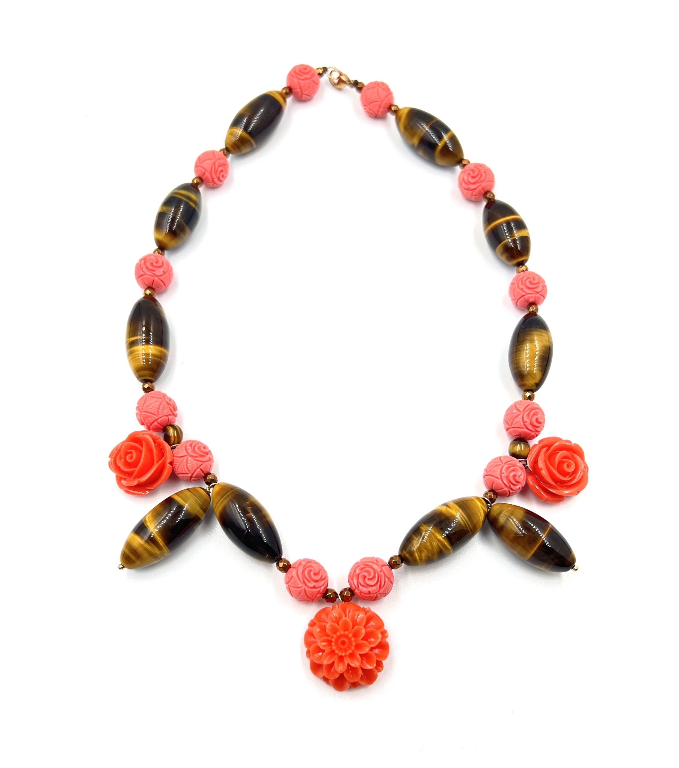 A vivid, joyful necklace with vintage tiger eye stones, carved resin beads and flowers.