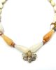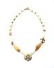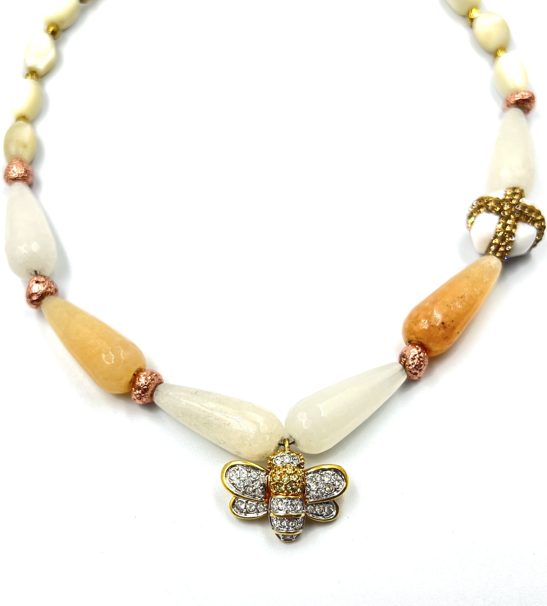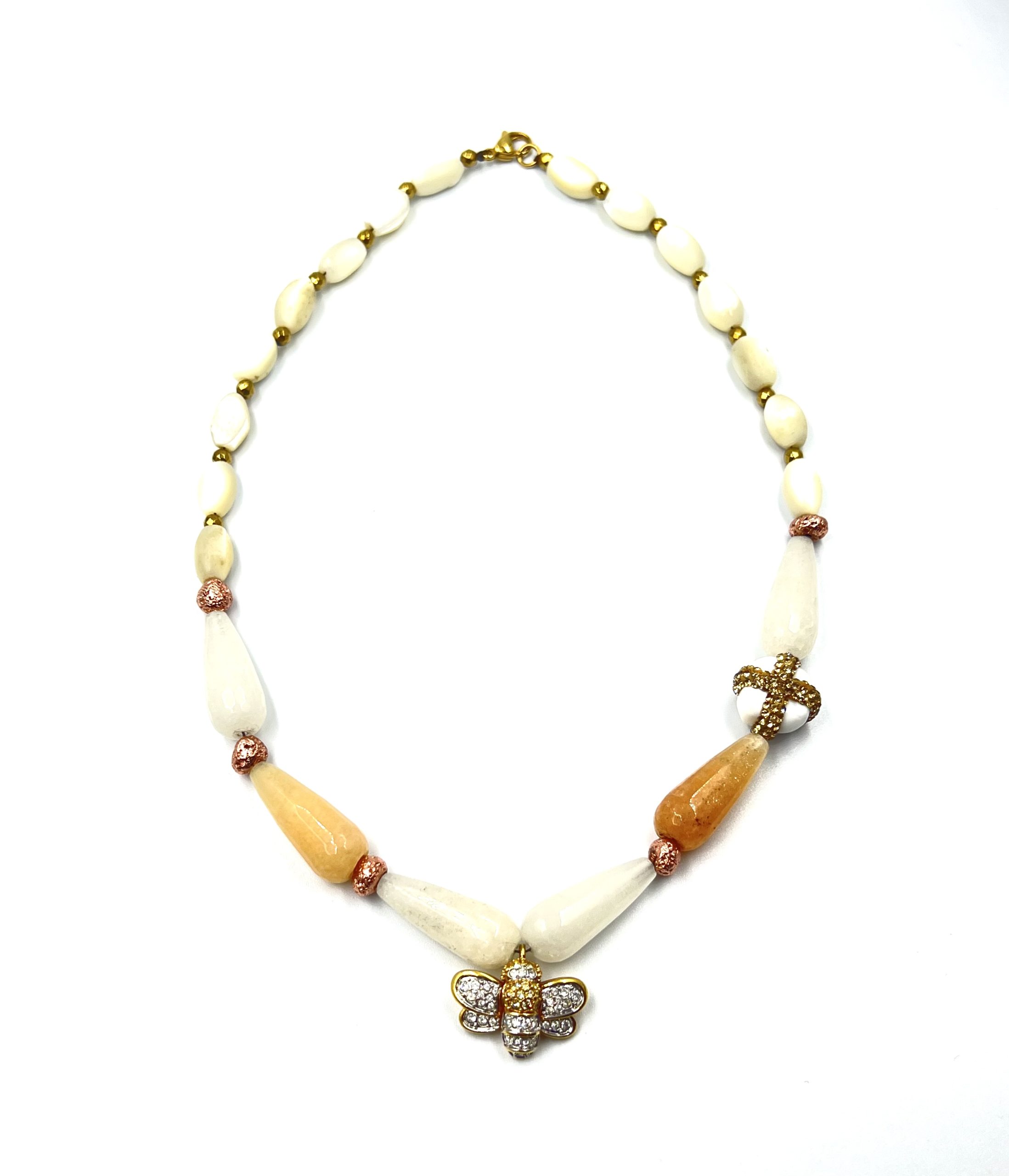 A necklace made with original vintage mother of pearl beads and jade , featured with a vintage Swarovski Bee charm.