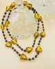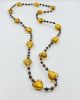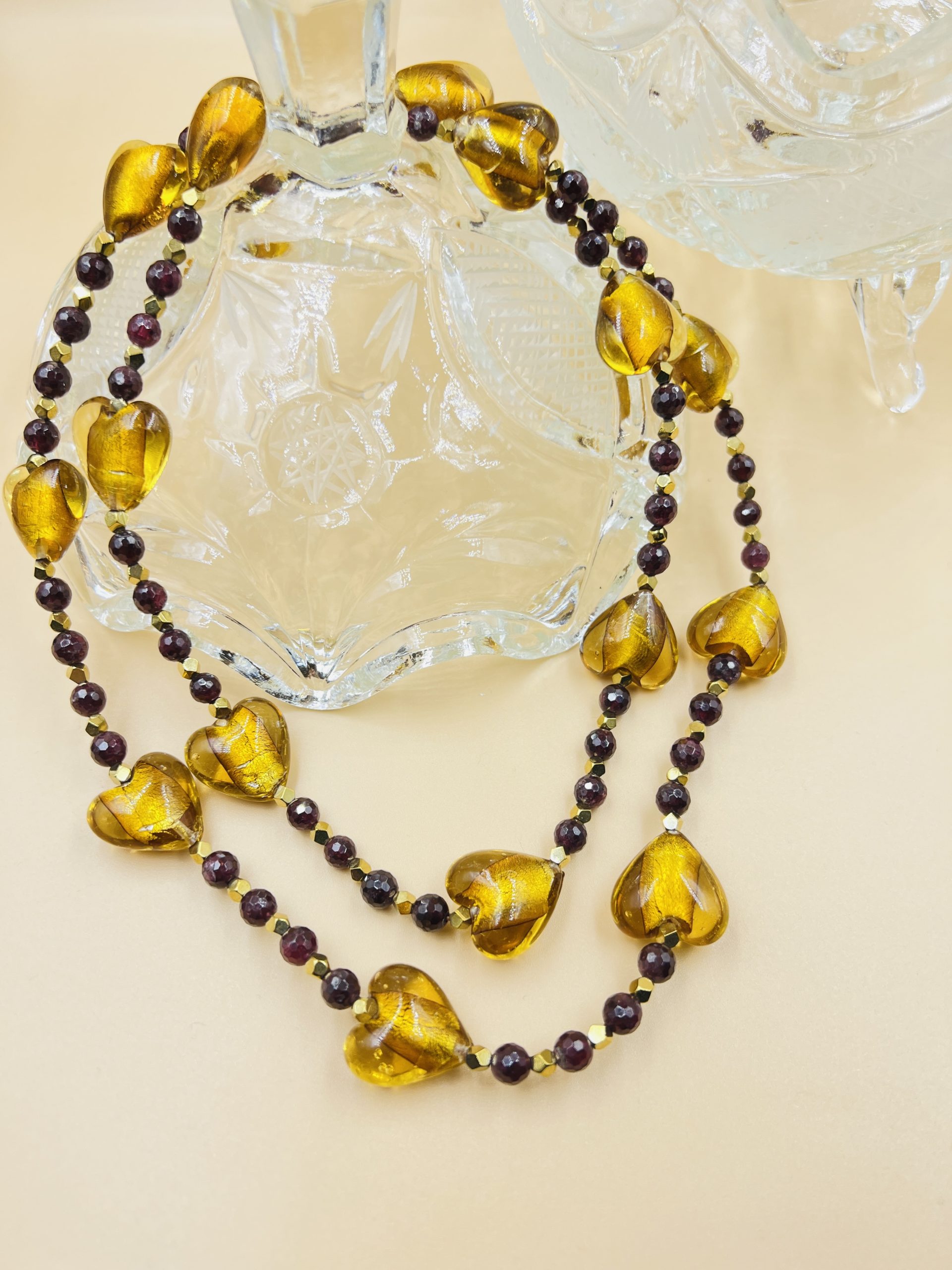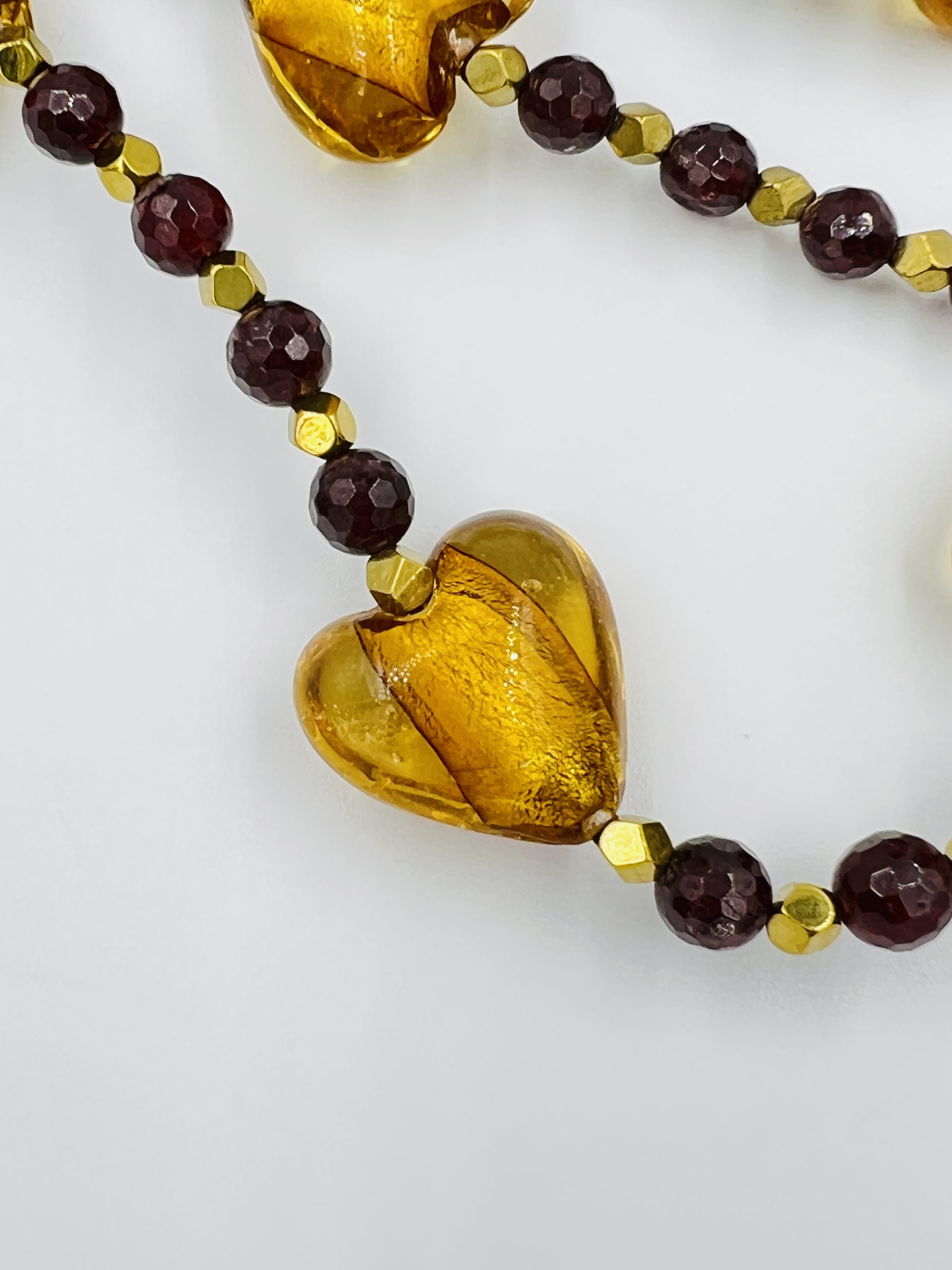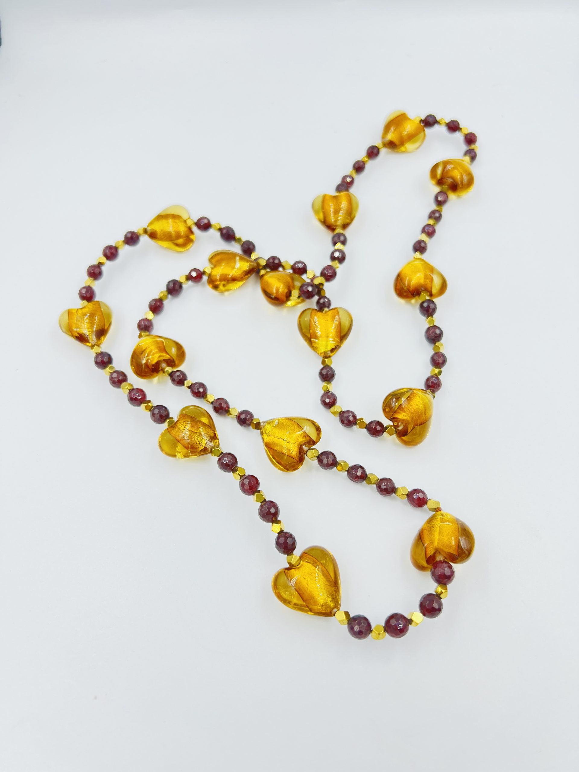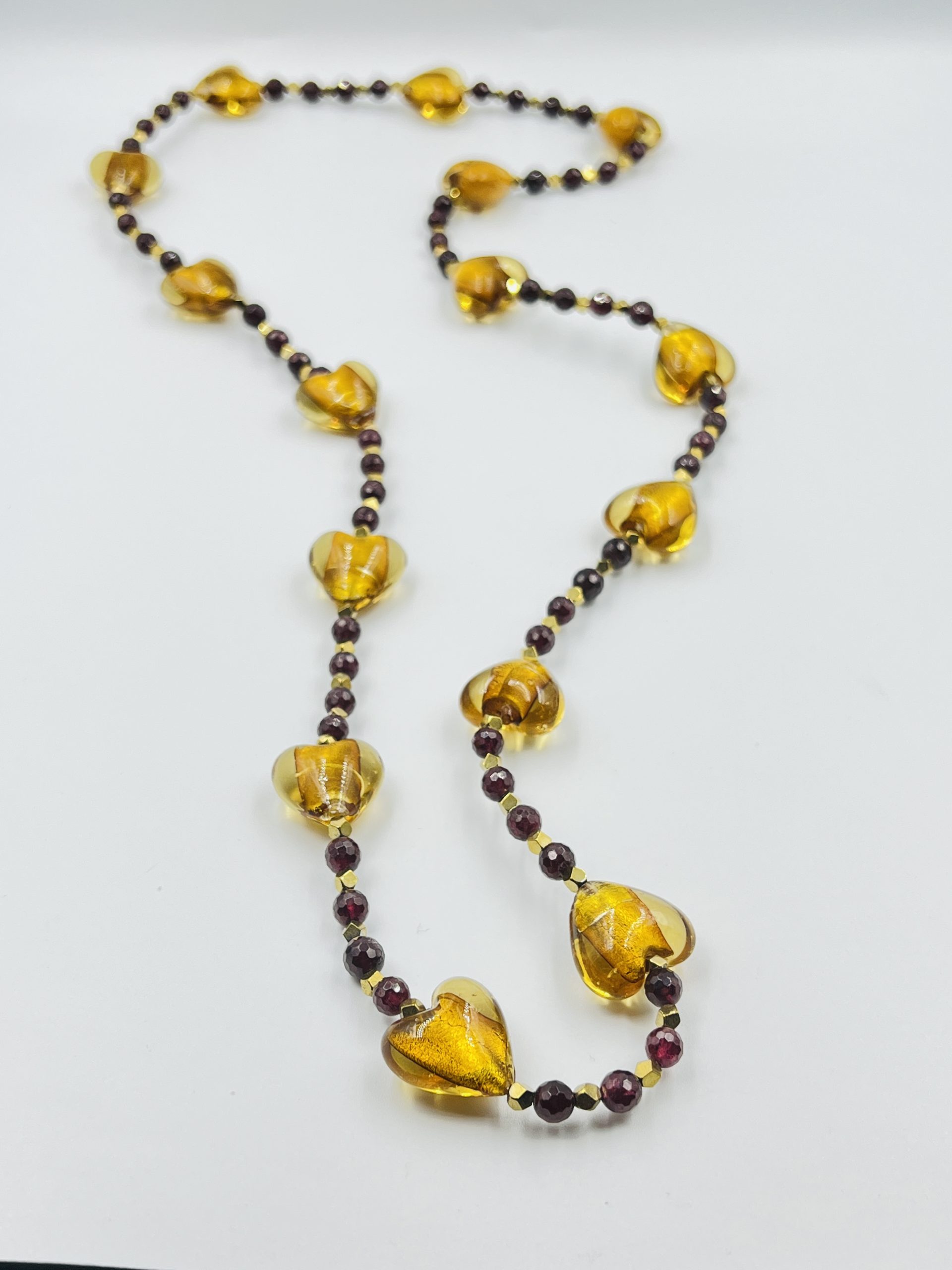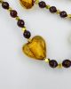 An astonishing long necklace made of murano hearts in honey color, together with precious bloodstone beads!