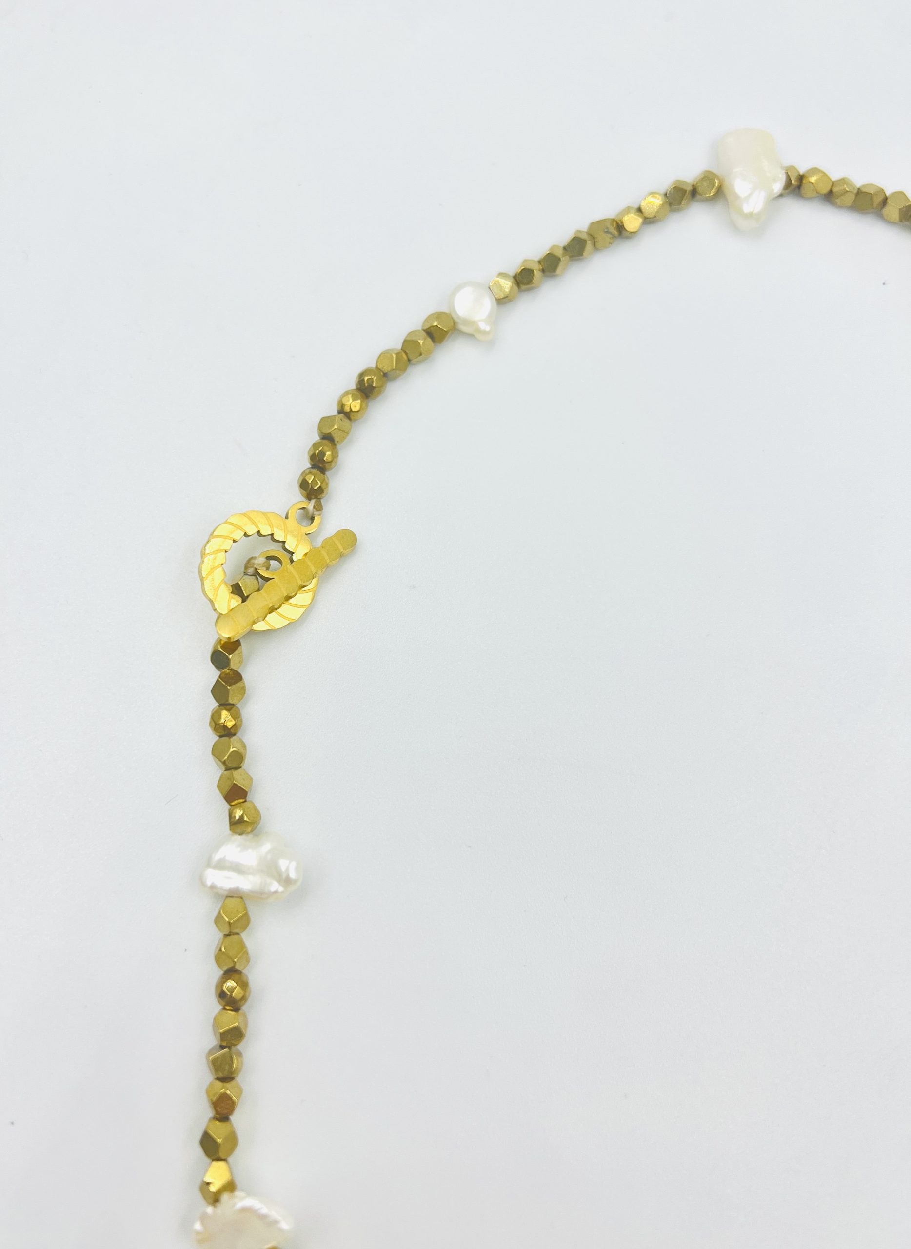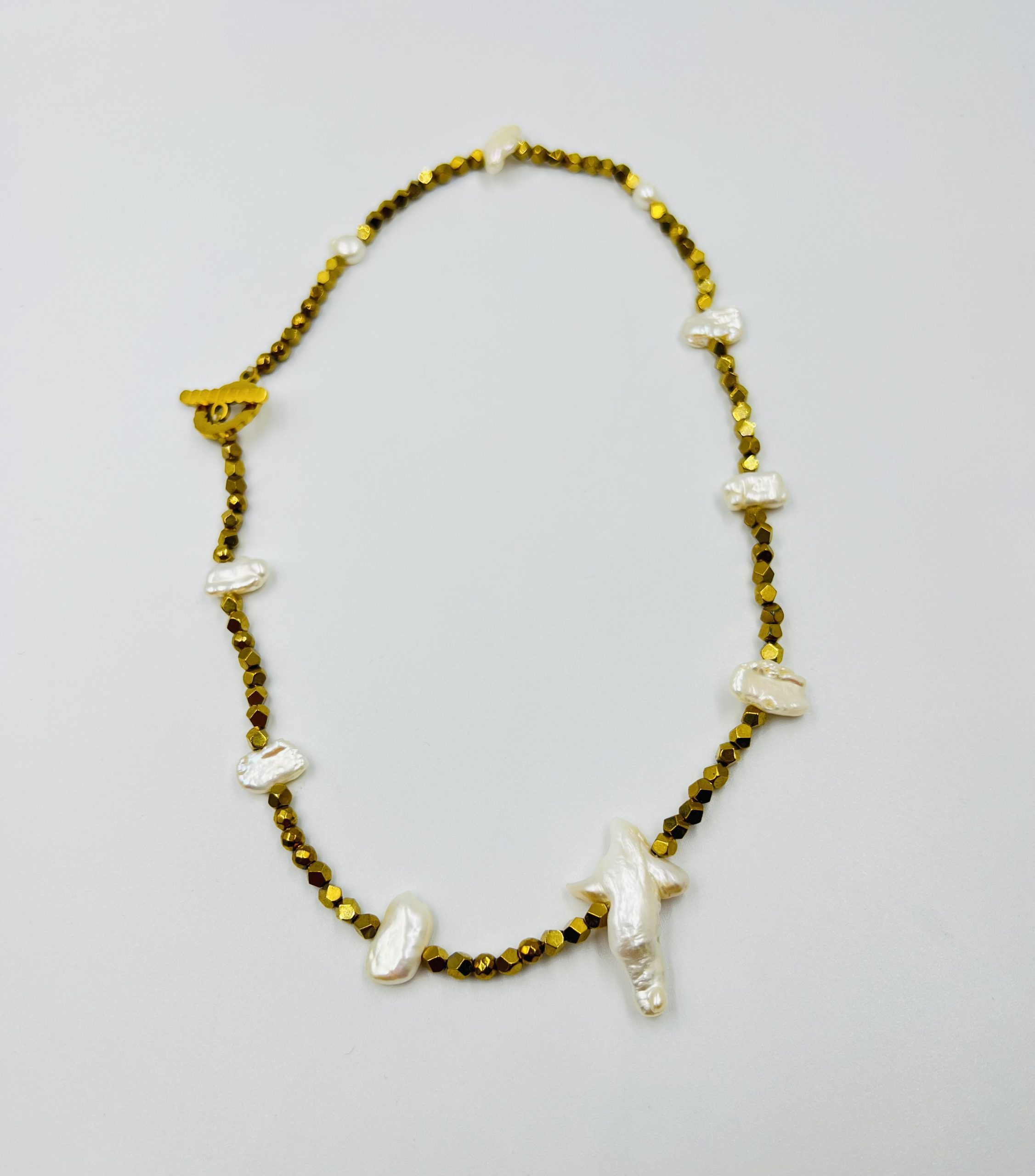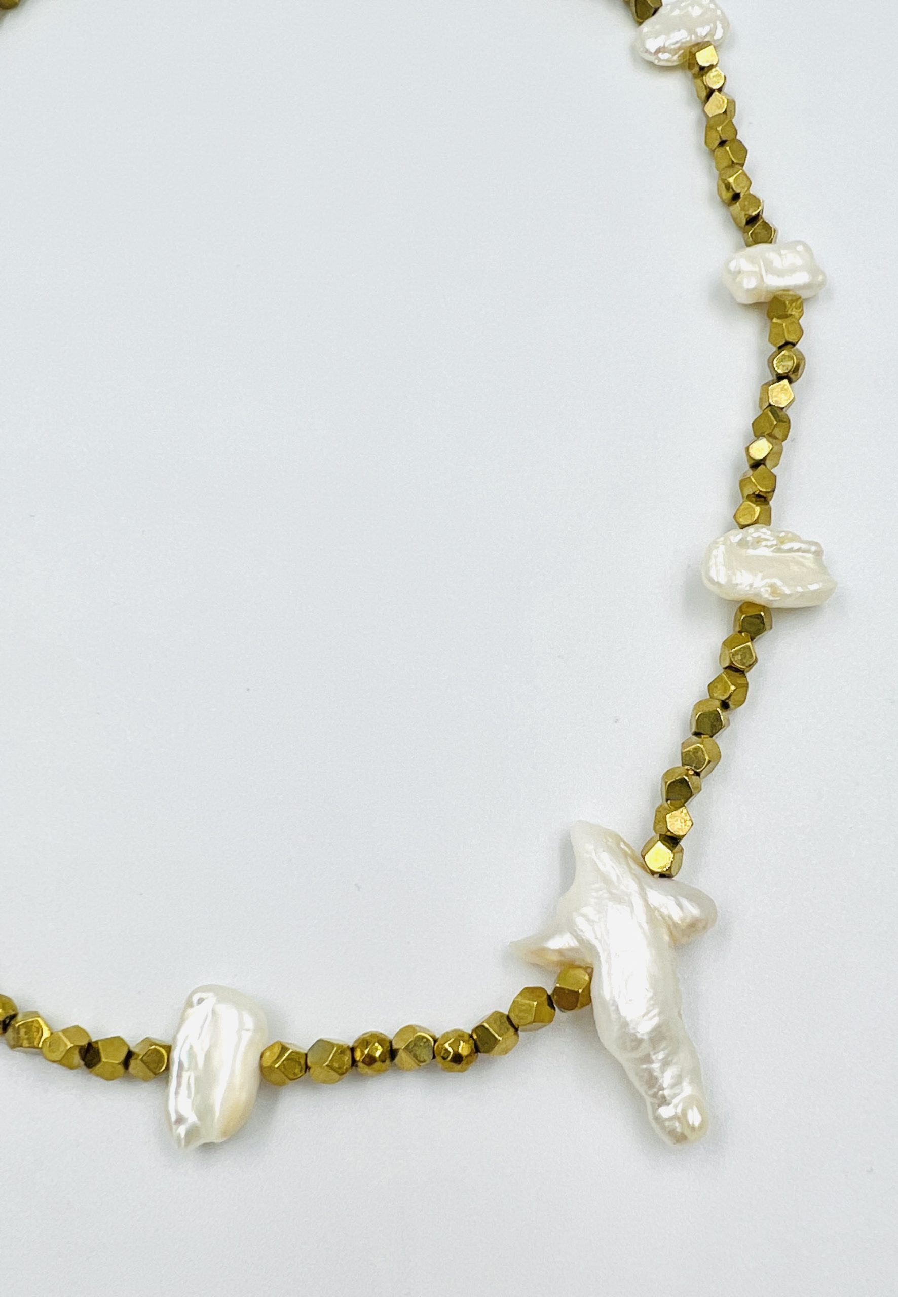Petit chic short necklace with biwa pearls and golden hematite beads. To wear all day long and add a chic colour to your daily outfit.